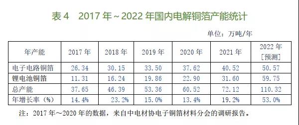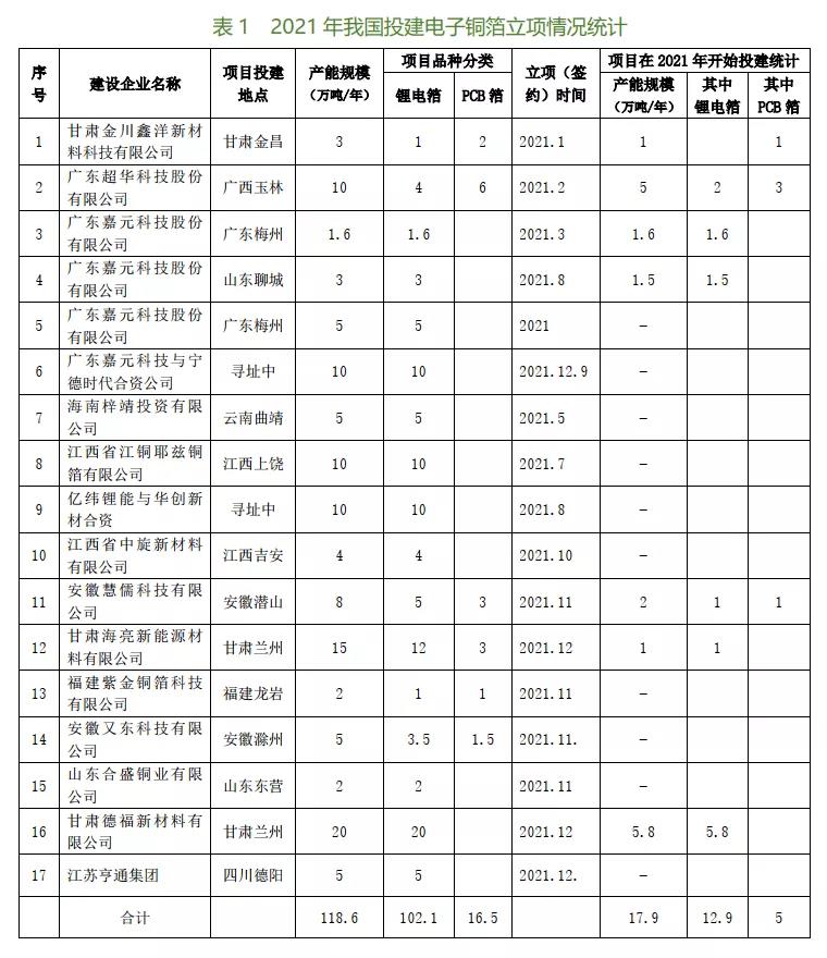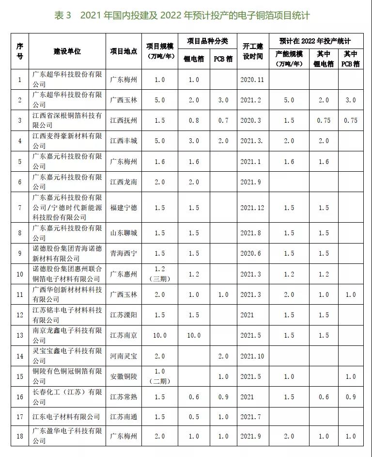 表3的統(tǒng)計數(shù)據(jù),是根據(jù)在2020~2021年開工建設(shè)的進(jìn)度及計劃在2022年間實現(xiàn)投產(chǎn)的情況逐一調(diào)查(包括對30多家新投建銅箔廠家的問卷調(diào)查,并以此反饋意見為準(zhǔn))所得到的。