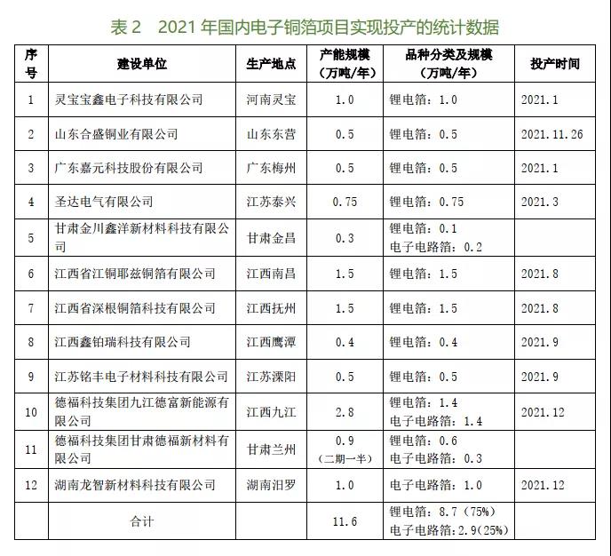表2給出了2021年國內(nèi)新建電解銅箔項目實現(xiàn)投產(chǎn)的統(tǒng)計數(shù)據(jù)。